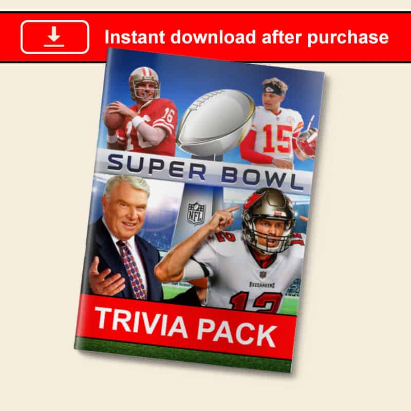 The Super Bowl Trivia Pack is a must for any sporting trivia night. The quiz pack contains 350 multiple choice questions including content on the biggest games, biggest players and famous moments.